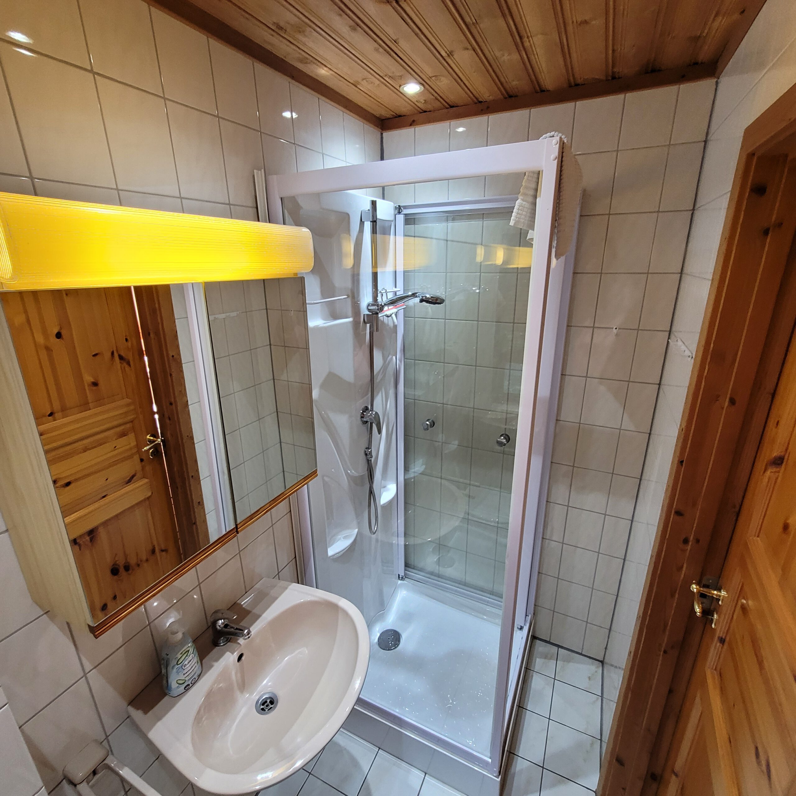 Im Inneren des Holzhauses erwartet Sie eine behagliche Atmosphäre. Es bietet Platz für bis zu 8 Personen und verfügt über 3 Schlafzimmer sowie 2 Badezimmer, jeweils mit Dusche. Ein Wohnzimmer mit direktem Zugang zur überdachten Terrasse lädt zum Verweilen ein. Besonders hervorzuheben ist die großzügige Küche mit Kamin, einem Esstisch für bis zu 8 Personen und einem direkten Zugang zur Terrasse.